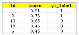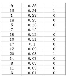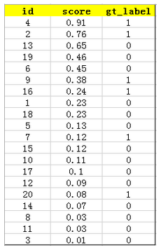 首先用训练好的模型得到所有测试样本的confidence score,每一类(如car)的confidence score保存到一个文件中,如comp1_cls_test_car.txt。假设共有20个测试样本,每个id,confidence score和ground truth label如下: